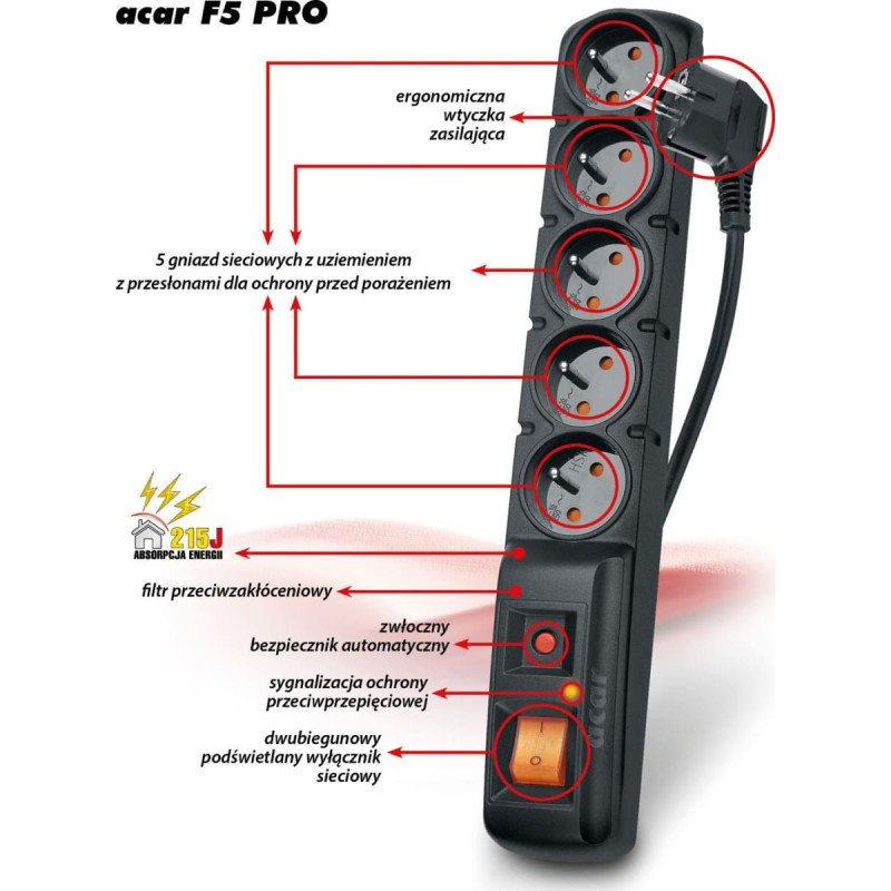 Acar Power strip Acar F5 PRO overvoltage 5 sockets 3 m black (W0093)