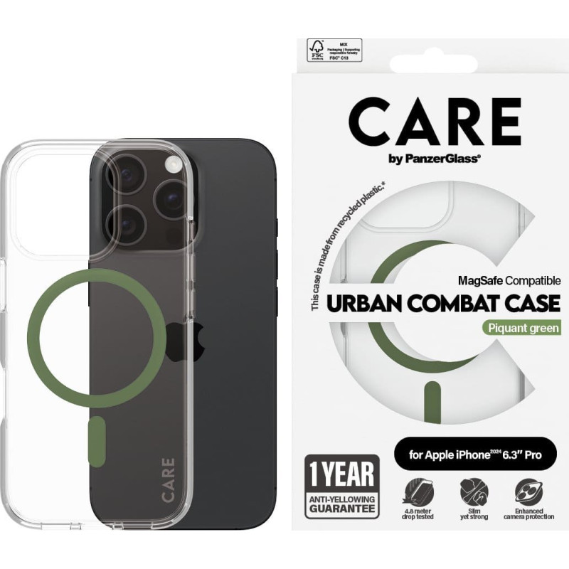 | PanzerGlass CARE by ® Flagship Case Transparent Urban Combat w. Green MagSafe iPhone 16 Pro. Somas veids: Aploksne, Zīmolu saderība: Apple, Savietojamība: Apple - iPhone 16 Pro, Produkta krāsa: Caurspīdīgs | ||||||||||||||||||||||||||||||||||||||||||||||||||||
